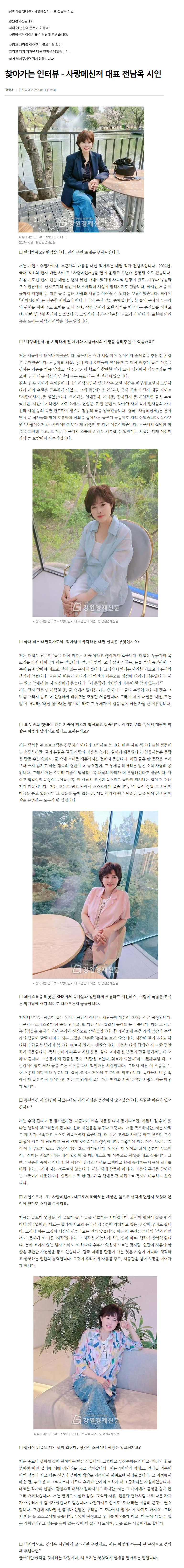관련링크 https://www.gwbiz.kr/88911 68회 연결 본문 찾아가는 인터뷰 - 사랑메신저 대표 전남옥 시인강원경제신문에서저의 21년간의 글쓰기 여정과사랑메신저 이야기를 인터뷰해 주셨습니다.사람과 사람을 이어주는 글쓰기의 의미,그리고 제가 지켜온 대필 철학을 담았습니다.함께 읽어주시면 감사하겠습니다.